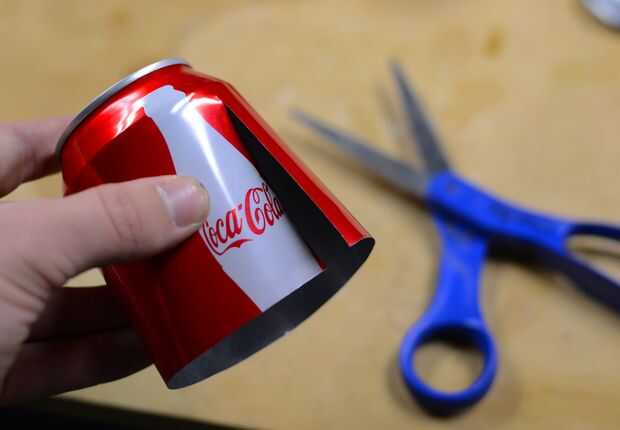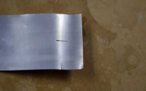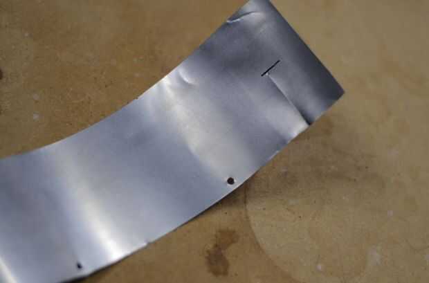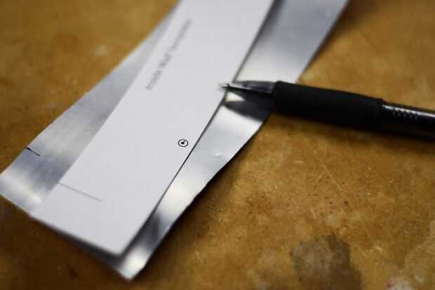 En primer lugar, usted necesita cortar un pedazo plano de una de las latas que ya ha usado. Debe haber un lado recto desde donde cortar la parte superior o inferior hacia fuera. Esto puede usarse para hacer sus medidas iniciales. Primero se corta la tira hasta 2 1/4" alto, utilice un borde de la plantilla para hacer estas mediciones. Es muy probable obtener mejores resultados si se corta esta parte con un borde recto. Más cerca las líneas deben ser perfectamente paralela, mejor pondrán el sello de la pared en la parte superior e inferior. A continuación, poner la plantilla y cortar a la anchura, que es 7 5/8". Hacer dos marcas de guía para el corte de cada raja, luego use un par de tijeras para cortar. Por último, marque los agujeros para que el combustible pase a través en la pared. Lo hago por poner la plantilla sobre la parte, a continuación, presionar un lápiz en el centro del círculo. Los agujeros pueden ser bastante, o simplemente puede cortar pequeñas muescas hacia fuera en la parte inferior.