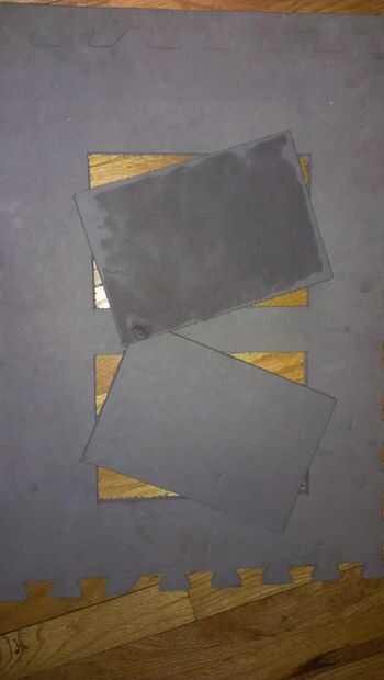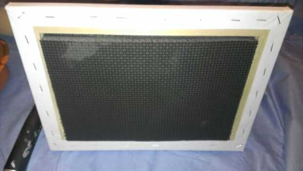 Para obtener una mejor imagen el lienzo debe ceder un poco cuando el ladrillo se aplica. Si no hay un soporte, el ladrillo puede rasgar a través de la lona. para lograr esto, corté trozos de mi estera antifatiga que tengo en el garaje. Ajuste las piezas dentro de la estructura de madera en la parte posterior del lienzo. He creado dos para que sean más gruesas que la cavidad creada por el marco. Esto asegura que no demasiado estirar la tela cuando se aplica presión.