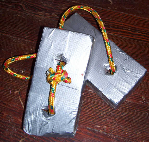 Después de que has cortado y derrita las puntas de la cuerda de cadena a través de un ladrillo y luego el otro y atarla bajo uno de los ladrillos.