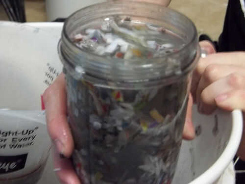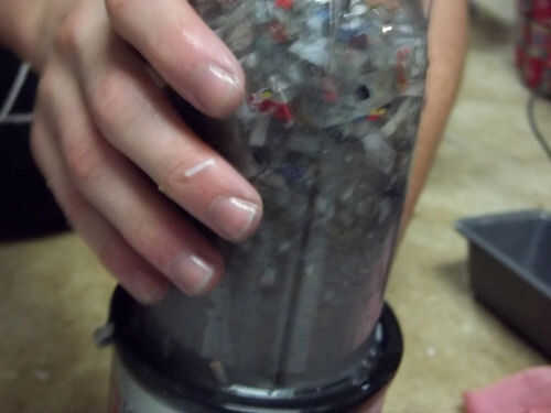 Usé una bala mágica parcialmente para mezclar mi papel en la pulpa.  Puede utilizar cualquier batidora tienes.  Quise utilizar una que no uso para el alimento.  Es aceptable utilizar una licuadora para papel y alimentos.   Añadir alguna pasta de papel y el agua a la licuadora y encenderla.  Usted tendrá que experimentar con la proporción de agua para papel para encontrar lo que combina la más fácil.