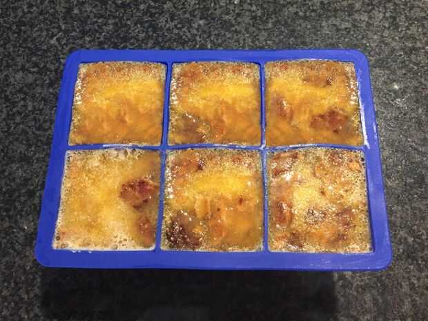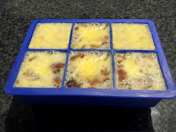 Vierta la mezcla en la bandeja del cubo de hielo. Me gusta usar una bandeja de silicona de 2". Cada cubo tiene alrededor de 2 huevos, dependiendo del tamaño de huevos que utilizas. Luego coloque la bandeja en el congelador hasta que los huevos estén completamente congelados. Este es el truco para líquidos de sellado al vacío. De lo contrario los huevos, jugo, o cualquier líquido que está sellado a chupar de la bolsa y en el sellador del vacío.