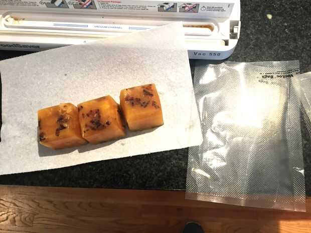 Una vez que los huevos estén completamente congelados, pop de la bandeja y cortarse bastante bolsa de sellador para que puedan caber en. Seguir las indicaciones hacia su sellador de alimentos vacío pack y sellar sus cubos. Después de eso, me gusta envolverlos en papel de aluminio para que mantengan congelados un poco más y entonces utilice un rotulador para etiquetar los ingredientes. Ahora usted tiene un buen sellado, congelado, ladrillo de campo alimentos que ayudarán a mantener todo en su refrigerador frío ya. Y ya que está sellados no debe preocuparse sobre yucking por el hielo derretido hielo de agua en la parte inferior de la nevera.