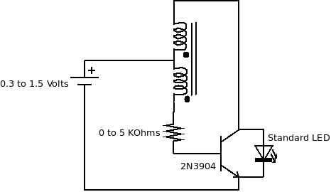 En primer lugar, por favor mire el diagrama del circuito. El "grifo de centro" de nuestro estator está conectado con el + final de la batería. Los dos extremos restantes se conectan al colector y la base (a través de una resistencia) de su transistor. Para la resistencia te recomiendo un resistor variable con algo como 0 ohmios entre 5Kohms, aunque nunca he necesitado usar una resistencia mayor de 1kOhms en un circuito de ladrón de joule. El emisor está conectado directamente al lado negativo de la batería. Por último, se conecta un LED a través del transistor; pata positiva en el colector y el negativo de la pierna en el emisor.