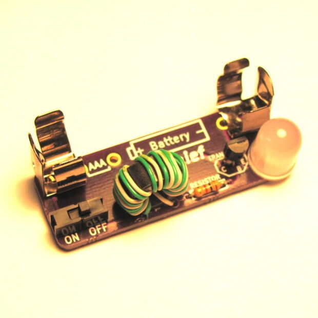 quiere un circuito Joule Thief en un paquete brillante delgado? ¿Puntos geek grave es alta en la agenda de la manitas de la visión de futuro y qué mejor manera de hacerlo que con las tripas recicladas de una unidad de disquete, paso a paso motor o pr