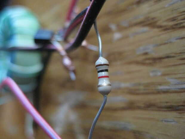 color opuesto a cada lado y girar juntos. luego ya no soldadura de cualquier alambre, corte por varios alambres pequeños para armar el resto. a menos que quieras soldarlo puede omitir esta parte. pero tomé un trozo de alambre y conectado a uno de los cables solo en la bobina (no importa que uno) y conecte el otro extremo de la pieza de alambre a la resistencia de ohmios k 1, luego tomar otro trozo de alambre y conectar a otro cable solo que irá a la pata del