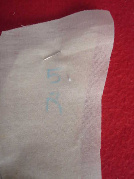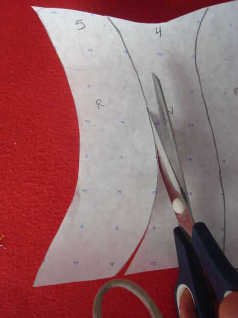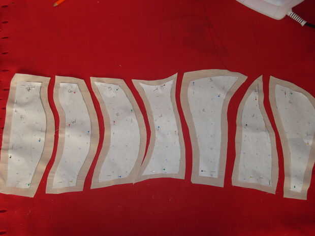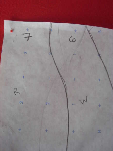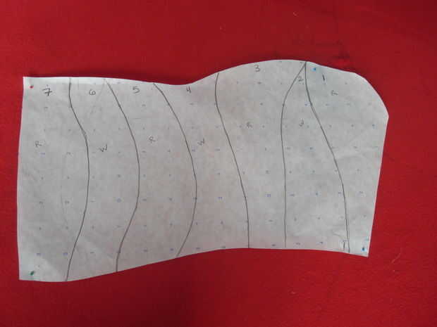 • En una de las marcas de piezas patrón 7 secciones como se ve en la imagen.  No tiene que ser exactamente el mismo.  Marcar cada sección con un número y una letra para indicar de qué color serán (rojo/blanco cada otra pieza).