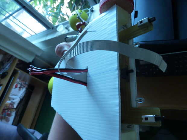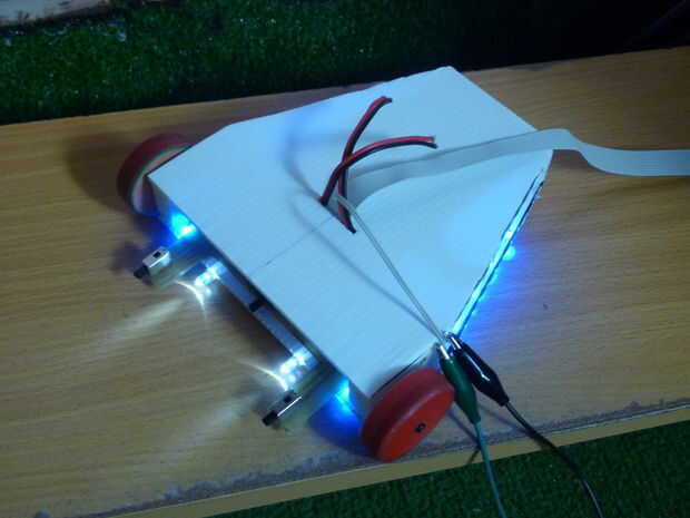Te acuerdas de las tres piezas que cortamos? bien necesita otro uno de ellos ahora corte un agujero sobre la misma zona que sale el cable para la alimentación. Entonces pase los cables de la placa de potencia para arriba a través de luego el LED cables hasta entonces los cables de los motores. Luego pegamento caliente el siguiente nivel hasta los rieles laterales (al lado de las cajas de baterías) y la parte superior de los motores.