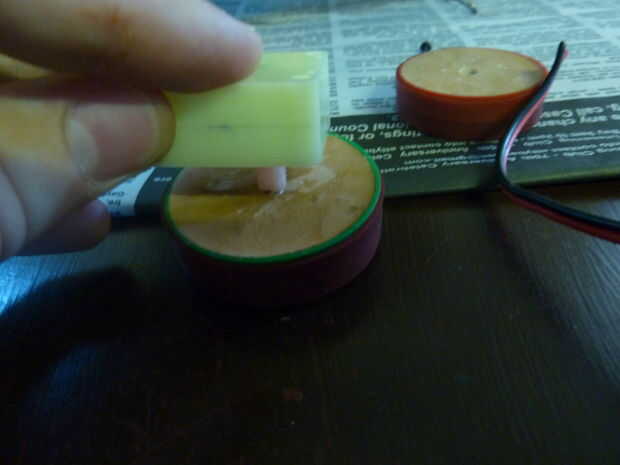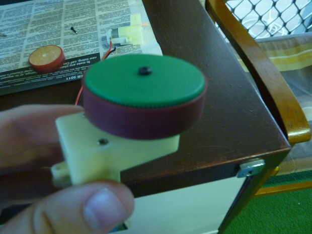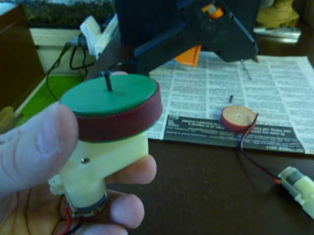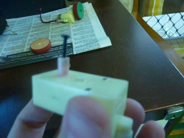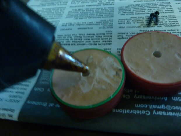 Una vez que la masilla se necesita llevaba algunos de la masilla y también perforar un orificio para el tornillo. Para ello un taladro viene en práctico como puede establecer para una determinada profundidad y mantenga el agujero de un perfecto 90 grados. Una manera de superarlo es encontrar la longitud de sus eje y marque esta distancia en una broca con cinta los motores. Entonces desglosar el centro hasta llegar a la cinta. Luego perfore un agujero en el centro de este agujero del tamaño del tornillo que está utilizando a su rueda en su eje con el tornillo. Antes de poner la rueda en algunos pegamento caliente en el agujero, entonces caben rueda en el eje del motor y el tornillo en.