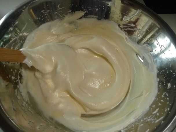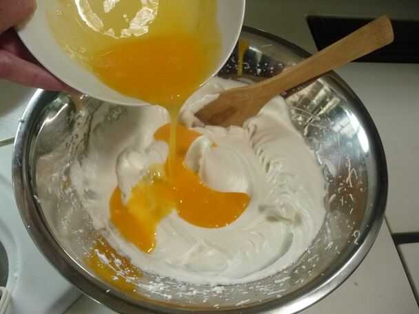 5. batir las yemas ligeramente con un tenedor. Doblarlas suavemente en el merengue con una cuchara de madera hasta que sólo combinado.