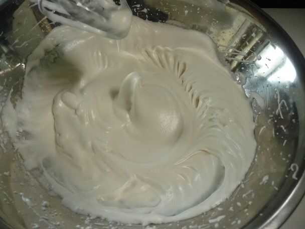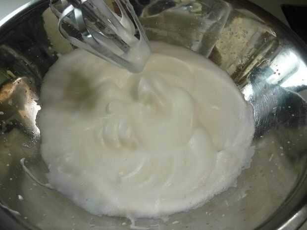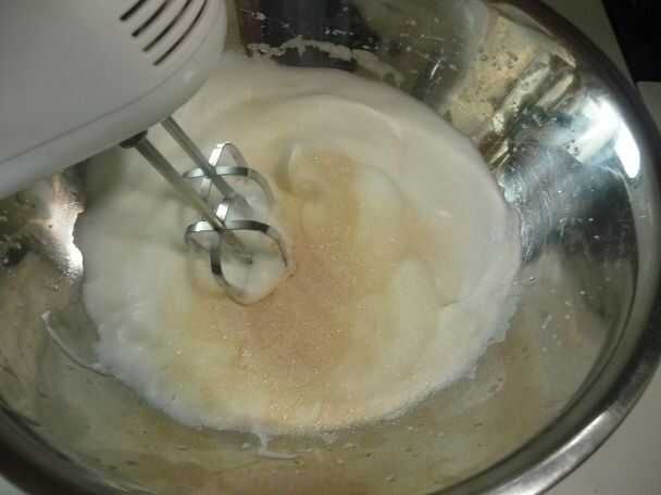 4. gradualmente agregue el azúcar y continuar batiendo hasta que las claras forman picos dura, brillantes.
