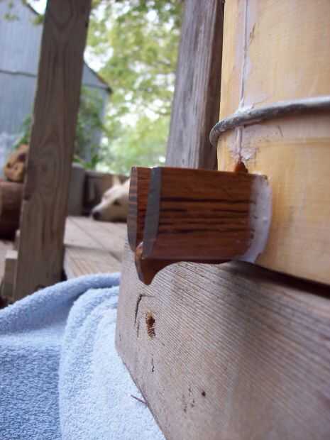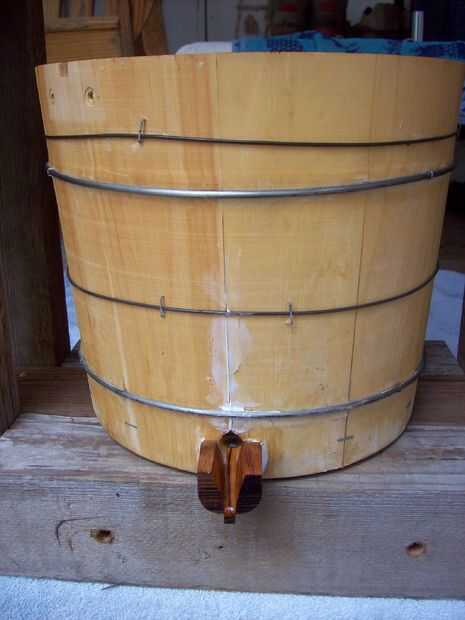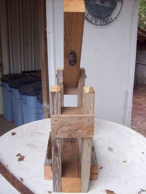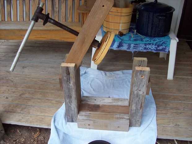 El marco está hecho de algún desecho camionetas 4 x 4 y 2x4s, el émbolo 1" tabla de pino y madera contrachapada (sólo porque me quedo sin pino) y el tornillo es un tornillo de banco. Para sujetar la cabeza del émbolo, I perforado y golpeado ligeramente un agujero de 1/4" en el extremo de la mordaza de tornillo y atornillados en. Después de cierto uso, he encontrado que lo mejor es si se corta el perno que sujeta el émbolo de modo que fondos hacia fuera en el agujero, de esa manera usted puede apretar sin hundir la cabeza del tornillo o arandela en la madera suave de pino cuando empiezas a presionar sidra. El cubo es una fábrica de helado barato balde con un pequeño agujero perforado en el lado y una espiga de algunos trozos de madera pegados en. Había sellado todas las piezas de la madera en contacto con la sidra con dos capas de acondicionador de bloque de carnicero de Howard.