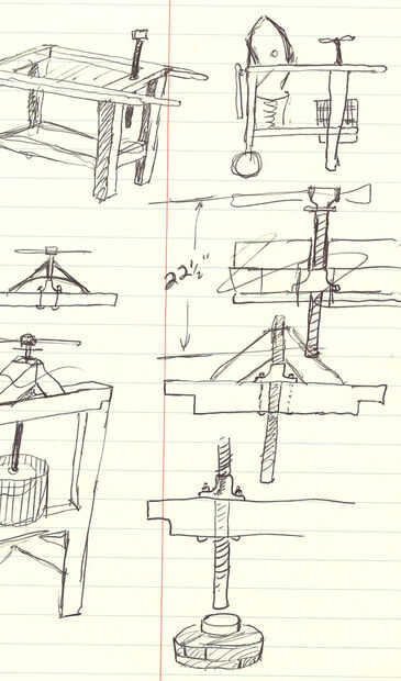 John se puso a trabajar el barril y el desagüe de rejilla que va debajo del edificio. Estos son básicamente un montón de palos con una sección trapezoidal: el barril es hecho por acorralar los palillos con bandas de aluminio, y el drenaje es una fila de palos con tres palillos más grandes y no trapezoidales. La rueda de molino es un cilindro cuyo eje gira perfectamente en su roble, con un poco aceite mineral para mantener las cosas deslizar a lo largo del buje.