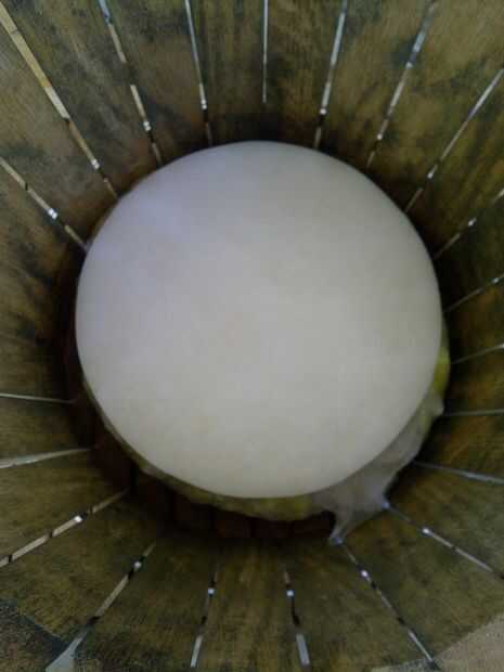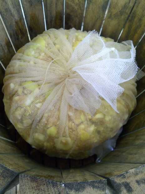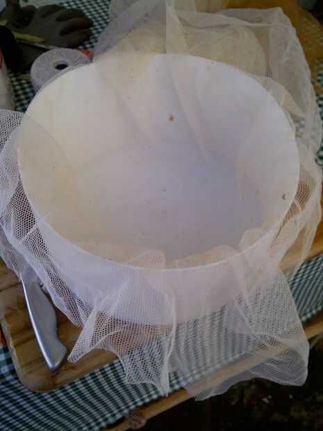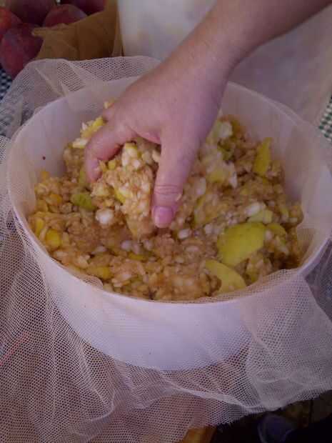 Alrededor de 20 libras de fruta más tarde, estamos salimos con un cubo lleno a 3/4 de manzanas de tierra, o "Orujo". La pulpa se coloca en un recipiente (la parte inferior 4 pulgadas o un cubo de plástico) que se alinea con el material de la red. Un "queso" es hecho atando las manzanas en un paquete.