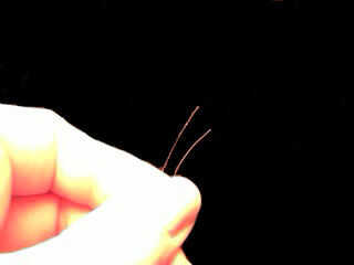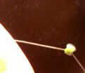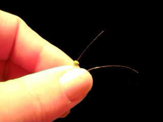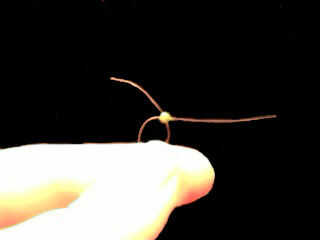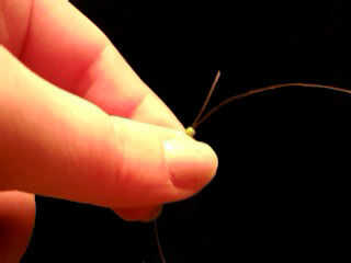 Tome ambos extremos de la cadena y la línea de pesca un grano (tapa color) en un extremo. Tome el otro extremo y cadena a través de la cuenta de la manera opuesta (ver fotos). Tire de ambos extremos uniformemente para que el grano está en la mitad de la longitud de la línea de pesca. Debe permanecer en el lugar en el propio. Si pones un anillo del salto en el, va a ser apretado contra el grano.