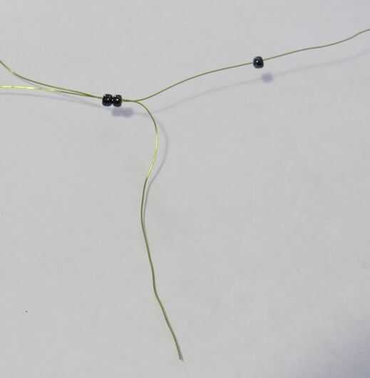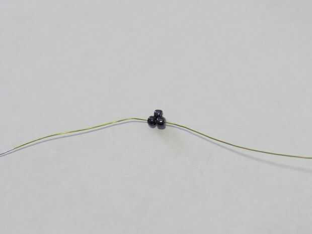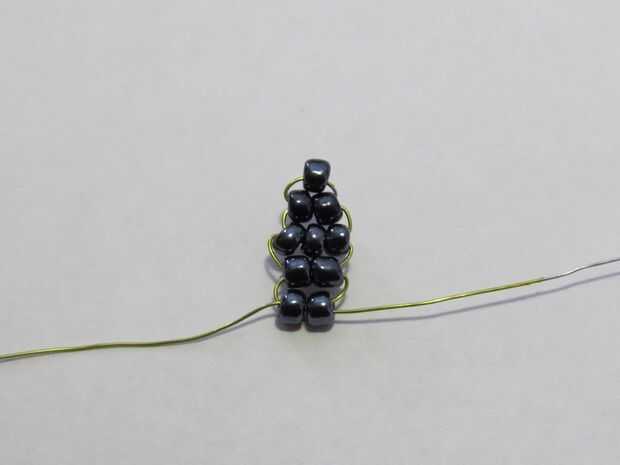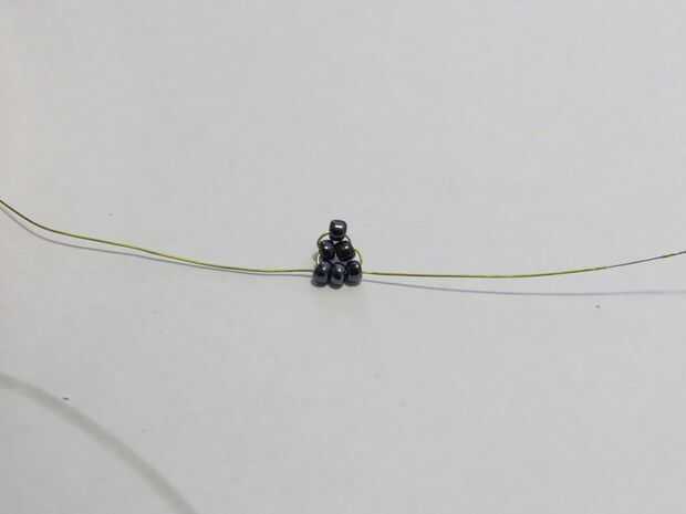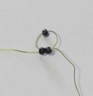 Hilo primero una bola a la mitad del alambre de metal. Añadir otro dos granos como en la imagen 1. Ahora tome el cable por el lado opuesto de donde poner los granos y del hilo de rosca a través como imagen 2 y 3. En este punto habría ido ambos extremos de los cables a través de las dos cuentas. Tire de los cables para que los granos se aprietan juntos hasta el primer talón (imagen 5). Debe terminar como un triángulo. Aprender a rosca porque esta es la técnica que se utilizará en el instructable. Hilo de otro 3 granos (puede hacer las cuentas en el exterior en un color diferente para representar ojos como imagen 9) seguido por dos filas de dos granos por el cuello.