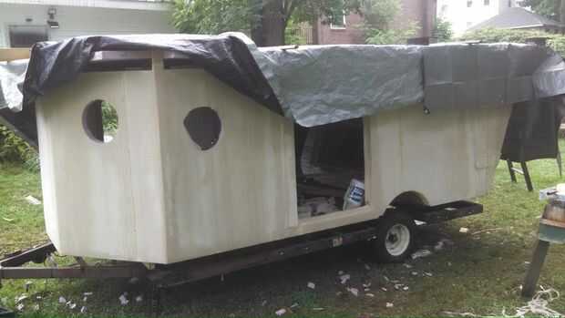 Para asegurar que la tela sostiene el techo y los lados de la lágrima firmemente, debe ser envuelta y pegada debajo del borde del piso. Para hacer esto fácil, usé un gato de carretilla con una goma cuña sobre el sillín, para levantar los extremos del cuerpo apagado el bastidor del remolque camper. Luego juego de piezas de madera de desecho entre el cuerpo y el marco y baje el extremo del remolque a la madera. Sólo necesitaba espacio suficiente para trabajar entre el marco y el cuerpo con mis dedos como que estira a la tela en su lugar.