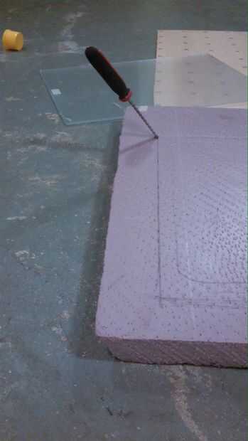 Cortar la parte superior y líneas laterales en Sierra de la espuma con el panel de yeso, manteniendo la Plaza de la hoja en la cara de la espuma, cortan el fondo del agujero de la ventana en un ángulo de 45 grados para que la pendiente coincide con uno en la parte inferior de la puerta de espuma blanco.