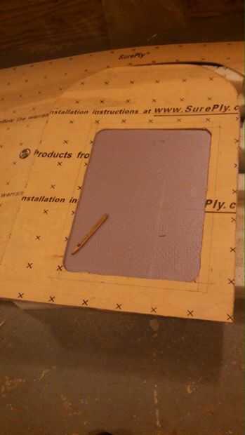 Medida 3/4" en cada lado de las líneas trazadas en el vidrio de la ventana, esta será la abertura de la ventana actual en la madera contrachapada. Utilice un objeto pequeño y redondo como un refresco para hacer esquinas redondeadas en la abertura de la ventana. Asegúrese de marcar la espuma y madera contrachapada dentro y fuera de caras, mucho del tiempo que está trabajando desde la parte posterior o interior cara de cada uno, cualquier error podría causar un rehacer.