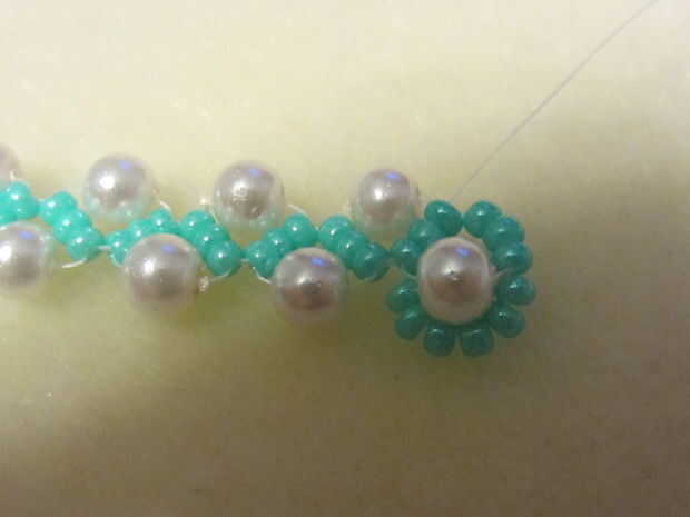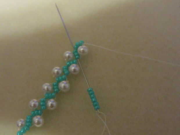 Una vez que tenga la longitud deseada, hilo 6 de las Rocallas 11/0. Pase la aguja con los granos de la 6 semilla a través de los granos de la semilla inferior 3 de la parte superior V. tirar a través y usted debe conseguir un círculo alrededor de las bolas de 4mm. Es su primera lágrima.