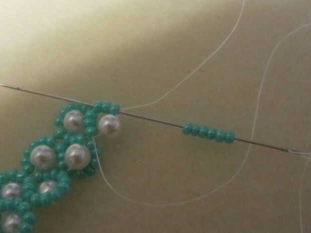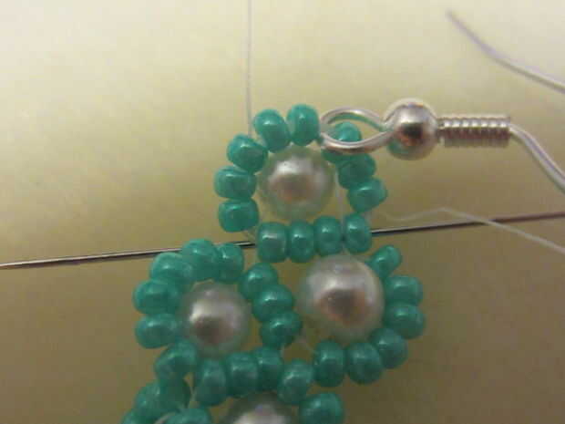Enhebrar seis mostacillas y tire de ellas a través de los últimos tres rocallas del pasado V. Desde donde el hilo es que sale del punto de la última lágrima, hilo de rosca de la aguja a través de los granos de la semilla inferior de la gota y la aguja a través de la lágrima del círculo hasta llegar a tres granos de la semilla desde el punto de la lágrima (los tres últimos de la V). Un cable pendiente del hilo de rosca y llevar la aguja a través de los últimos 3 rocallas de la lágrima.