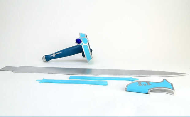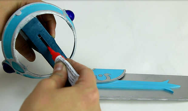 Utilice pegamento para unir todas las piezas. Empezar por que la hoja en el mango y usar un lápiz para marcar la profundidad entra. Pegue el extremo plano de la decoración de la hoja a esta línea y centro a lo largo de la hoja. A continuación coloque la envoltura sobre la decoración de la lámina y pegamento en su lugar. Por último, agregue el pegamento a la ranura de la empuñadura y agregue el pegamento a la ficha expuesta en la hoja. Ranura ambas piezas juntas y espere que se seque.