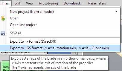 Archivo > Exportar en formato IGS (usted debe elegir un nombre sin ningún espacio ni carácter especial porque Java no gusta). Incluí mi exportación de heliciel: pale.igs (parece que Instructables no le gusta el archivo igs, pero obtendrás el PDF al final)
