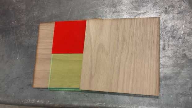 Sabía que mi brazalete iba a ser poco menos de cuatro pulgadas de acabado, así que corte mis espacios en blanco para ser cuadrados de 5 pulgadas-quería espacio para trabajo en el ranurador CNC de mesa. Un opaco acrílico rojo y un verde translúcido, fluorescente, lo hice pude probar cómo ellos dos se vería intercalados entre mi nuez superior e inferior.