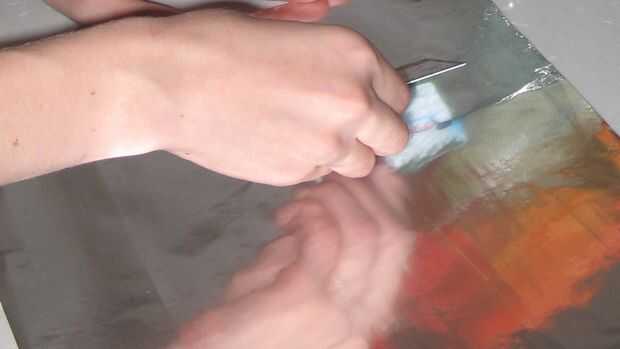 Vas a querer movimiento la hoja con la tarjeta en ángulo y va en una dirección y luego las otras múltiples veces por un lado y entonces los bancos y repetir el proceso en el otro lado para minimizar el rizado. Trate de hacer el papel de aluminio tan liso como sea posible para que no se forman burbujas más adelante. Cualquier suciedad en la mesa puede causar pequeñas protuberancias o arrugas en el papel que también hará que las burbujas o la hoja podría incluso rasgar, hacer tan seguro que la mesa esté limpia.