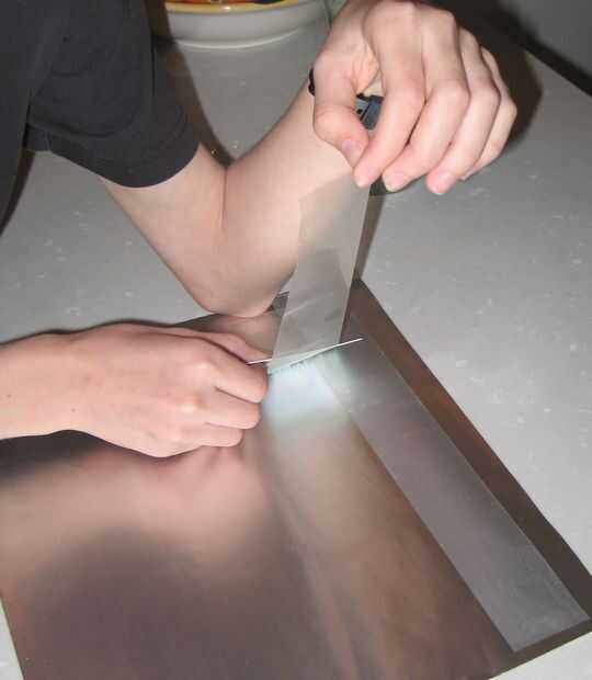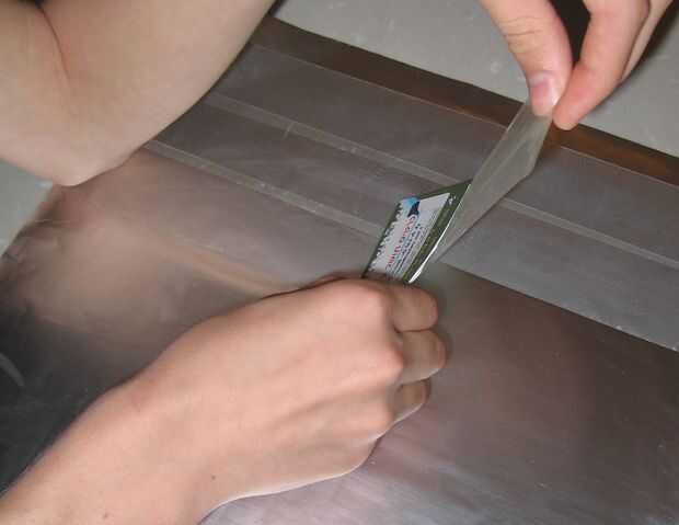 Ahora Alinee la cinta cuidadosamente y con mucho cuidado pega un extremo de ella para el papel de aluminio. Cómo colocar abajo de la hoja en primero decidirá si la cinta va cayendo suavemente o arrugas y crea burbujas. Sujete el otro extremo de la cinta en una mano y la tarjeta de crédito en otra parte. Asegúrese de que la hoja se lleva a cabo en el lugar. Se puede colocar un objeto pesado sobre él, pero yo prefiero usar mi codo como se muestra en las fotos.