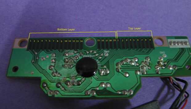Para asignar el esquema de los terminales del teclado no es necesario trazar los cables en el circuito, algo es mucho más fácil simplemente cortocircuitar cada par de pernos directamente en el controlador y para ver cuál es el resultado. En primer lugar, compruebe que los pernos ir a que la capa en el teclado y numerarlos de izquierda a derecha (véase la segunda imagen), a continuación, a partir de un pin en la parte superior de la capa y uno en la capa inferior corta perno cada par de pines con un cable mientras está conectado al ordenador por usb. Asegúrese de marcar todo esto en una tabla. Con esta información, usted puede marcar que las llaves tienen que pin conectado a ellos, puedes ver mi ejemplo en la cuarta foto.