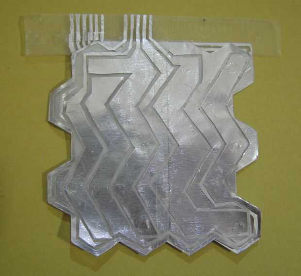 Cortando el circuitoPara hacer el circuito, hay que quitar algunos de aluminio entre los cables. Para lograr esto primero debemos cortar el papel de aluminio alrededor de los cables y las lagunas. La parte más delicada de todo el proceso está presionando hacia abajo la cantidad justa en el cuchillo: lo suficiente que cortará completamente el papel de aluminio (corte todo el camino es importante porque hará que pelar la hoja mucho más fácil más adelante) pero no lo suficiente para cortar la cinta, así (no se preocupe si esto ocurre varias veces al principio , en su mayoría no importa demasiado. Sólo asegúrese de que su circuito no desmoronarse.)