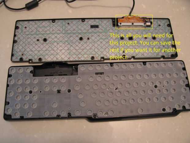 Con un destornillador Retire todos los tornillos en la parte posterior del teclado. Algunos de los tornillos pueden ser ocultados bajo pegatinas lo mira con atención. Dentro del teclado usted encontrará tres capas de plástico flexible con circuitos en ellos, que usted no necesita. También se encuentra una capa de silicona con cúpulas que usted no se va necesitando ya sea. Lo único que se necesita desde el teclado es el procesador de control y el cable usb que está conectado a él.