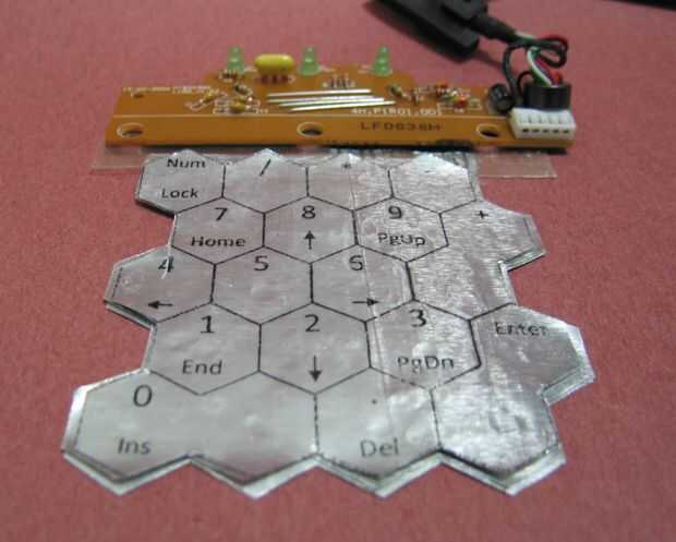 Hacer una tecla diseño en su computadora, imprimirla en un pedazo de LAF y cinta adhesiva en la parte superior del teclado numérico. Puedes ver mi diseño creada en Word, así como el acabado numpad que realmente funciona.
