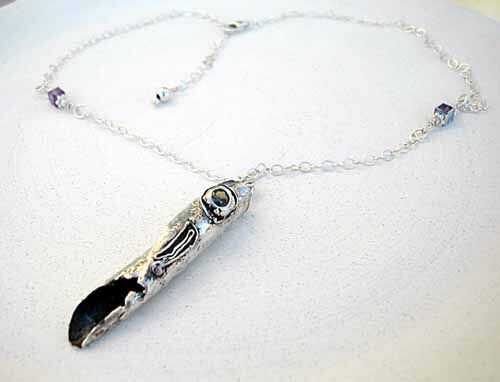este colgante inició como una interesante hoja enrollada. Muchas capas de arcilla de metal precioso de plata fino fueron pintados, capa por capa. A continuación, la plata fue calentada por un soplete hasta que la hoja se quemó lejos y fundido de la plata donde había estado la hoja. Una Circonita lavanda fue incluido en la escultura y el añadido de detalles. Muchos han comentado en su colgante único, de belleza.