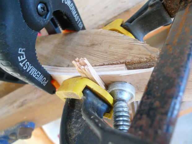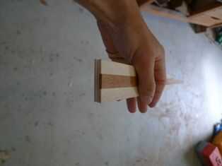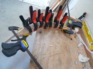 cubrió una superficie de la capa inferior y uno de la capa media. Esto significa el más incómodo, tres pedazo de capa superior no necesita pegamento en la parte inferior. sin embargo, frote un poco de pegamento en los bordes delgados de la pieza de caoba, para asegurarse de que las tiras me alojé juntos, borde a borde. Yo alineado los extremos de mis piezas, entonces había agregado mi capa cuarta, prueba de pegamento en la parte superior y coloca mi primera abrazadera en medio de la forma. luego le puse las pinzas a cada lado de aquél, a medio camino hasta el final. en cada extremo, usé mi abrazaderas de barra resistente. entonces comencé a llenar los huecos entre las 5 abrazaderas con otras pinzas. me puse a buscar lugares dónde las tres capas de madera no eran presionadas juntas. en algunos lugares que tuve que usar mis calzas de madera pequeño para presión uniforme todo. limpiado todo el pegamento que había sido exprimido hacia fuera. luego lo dejé secar. durante unas 12 horas con mi cola. Compruebe una vez más, tuyo.