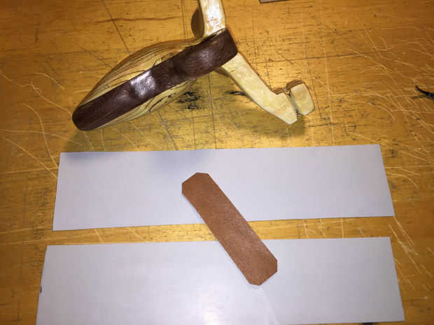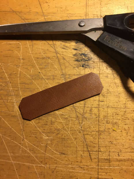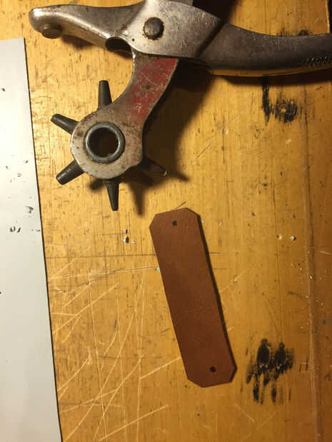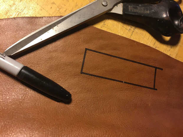 Dibujé el patrón sobre la piel utilizando una regla y un rotulador que 4.25" de ancho por 3/4" alto. La corté utilizando tijeras de trabajo pesado. Luego había cortado las esquinas y marcado la ubicación de los agujeros que necesitaba perforar para colocar las bandas. Utilicé una perforadora de cuero para hacer los agujeros iniciales en la bolsa, pero mi golpe de cuero era ni de cerca lo suficientemente grande. Así que había agrandado los agujeros en el cuero con un cuchillo xacto. Los orificios finales son aproximadamente 1/4" de diámetro.