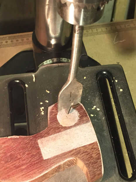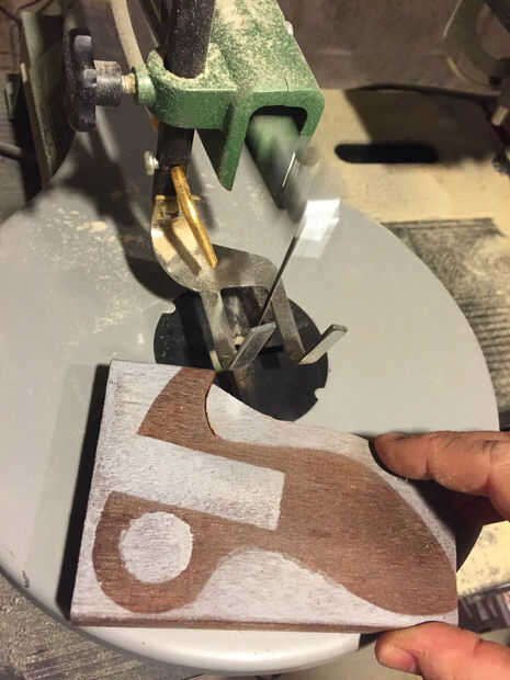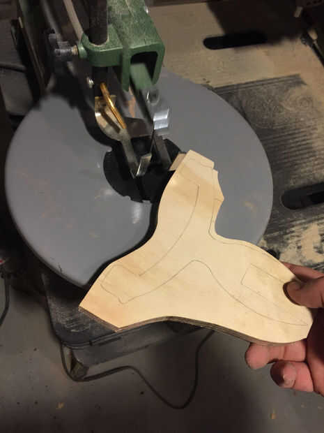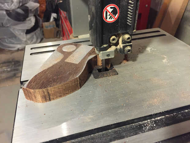 Corte las curvas más estrictas con la Sierra de calar y realizó la mayor parte del resto con una sierra de cinta. Recorte hasta utiliza una sierra de marquetería que era asombrosamente fácil. He utilizado una pala 1" broca para taladrar el agujero del dedo.