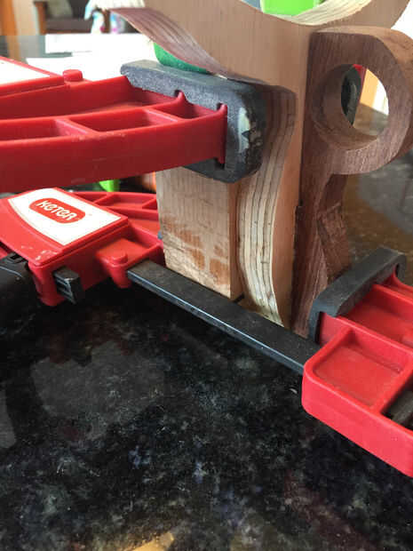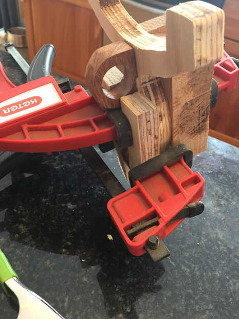 Una vez que el pegamento fue seco y la madera fue liberada, el raspado, lijado y la presentación podrían comenzar. Se dará cuenta de cuánto material adicional hay que tendrá que ser eliminados por lijado, etc.. No deje esta madera mucho extra si puede ayudar. Cortar las piezas de madera de relleno más cercana a la forma de la empuñadura y el tenedor como sea posible si se puede. Le ahorrará mucho tiempo en el camino.