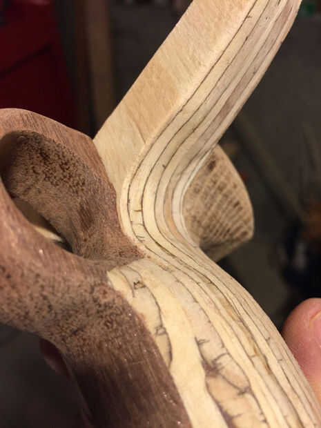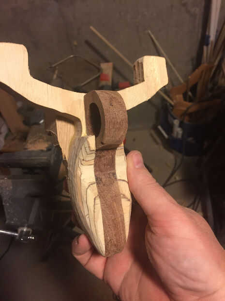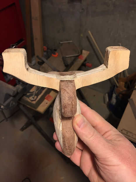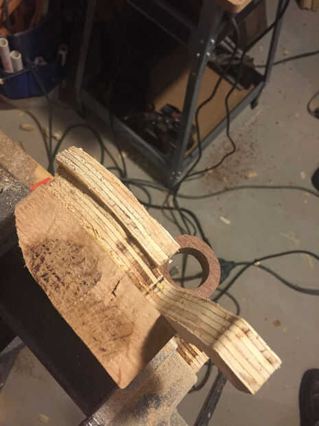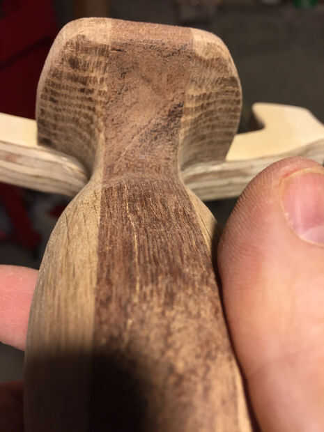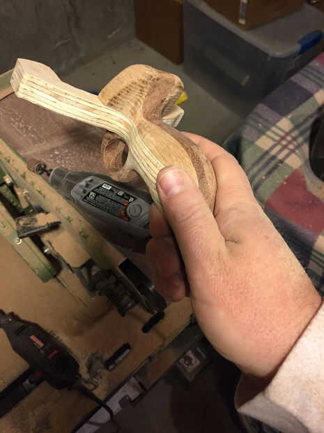 Forma de la madera de relleno a la forma de agarre con el más agresivo raspadores y sanders/lijas que tienes que realmente "cerdo" a la madera. Una vez que comience a cerrar la forma acabada, que desea tener más cuidado en cómo eliminar el exceso de madera. En este punto empecé en las curvaturas cerca del agujero del dedo y debajo de la horquilla con una herramienta Dremel con una broca de lijado con papel de grano 60. Realmente quita el exceso de madera rápidamente y era capaz de mantener en control muy bueno.
