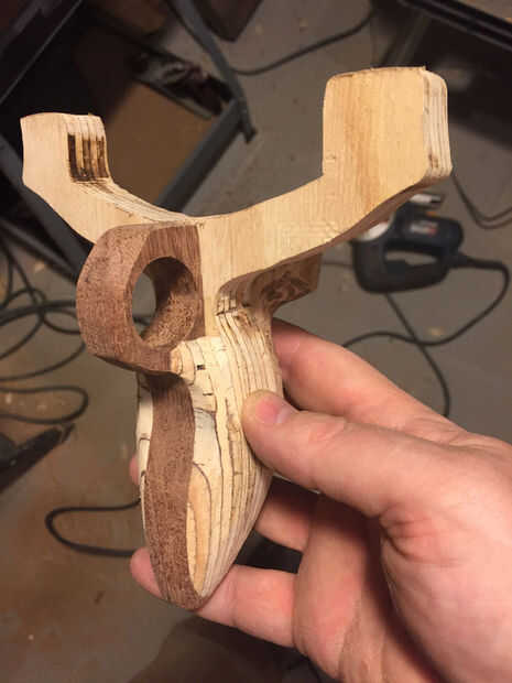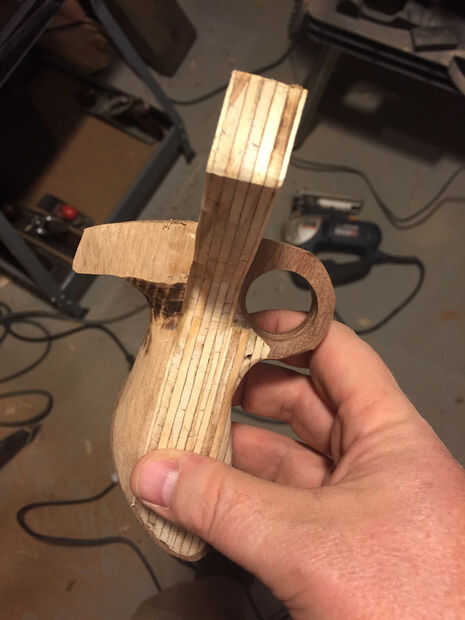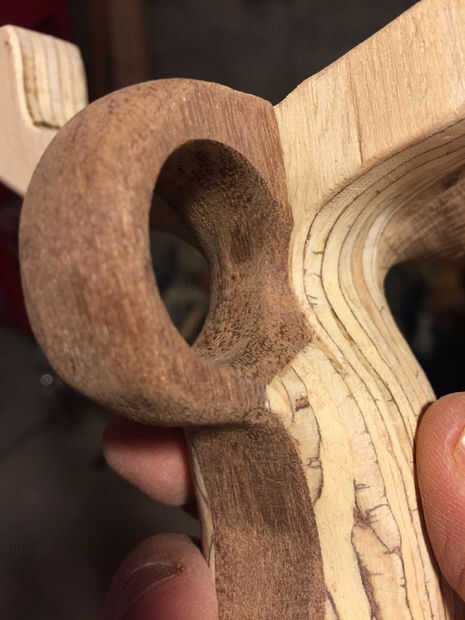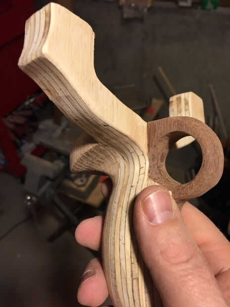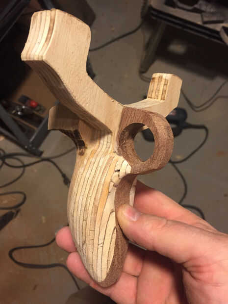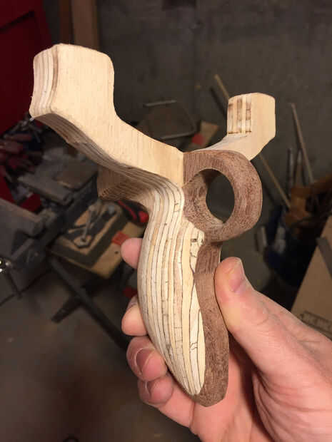 Continuar refinando la madera relleno hasta tener un liso, incluso textura a las áreas de agarre y el tenedor, por lo que se siente como si siempre hubiera sido una pieza de madera. Desea que la forma de la empuñadura que la forma de su pauta. Mientras que usted está formando, probar varias veces el ajuste con cualquier mano que vas a usar para sostener el tirachinas con cuando disparas. Cuando se siente correcto, entonces empezar subiendo el grano del papel de lija. Dejé "conformado" con papel de grano 220 y luego limpió un poco usando lana de acero 0000 en preparación para lubricación y polyurethaning.