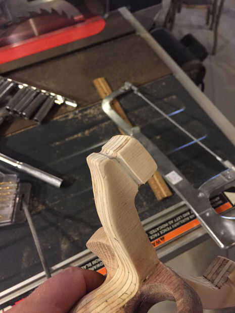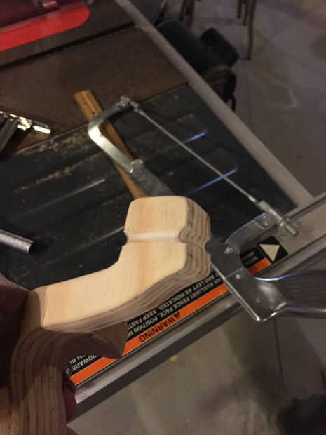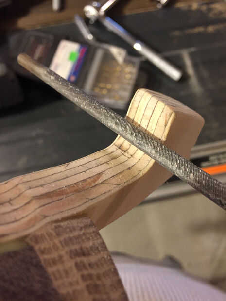Elige un punto unos 3/4" hacia abajo desde la parte superior de las horquillas para hacer ranuras de su banda. Con la sierra para metales con la cuchilla de corte de azulejo, corte la horquilla 1/2 ancho de hoja. Para ello alrededor del perímetro de cada tenedor. Una vez hecho esto, suavizar la ranura con un archivo de cola de rata o en un archivo de afilado de motosierra para ayudar a aliviar algunas de las asperezas y para ensanchar el surco. Una vez hecho eso, darle un alisado final con papel de grano 150 o modo Arena.