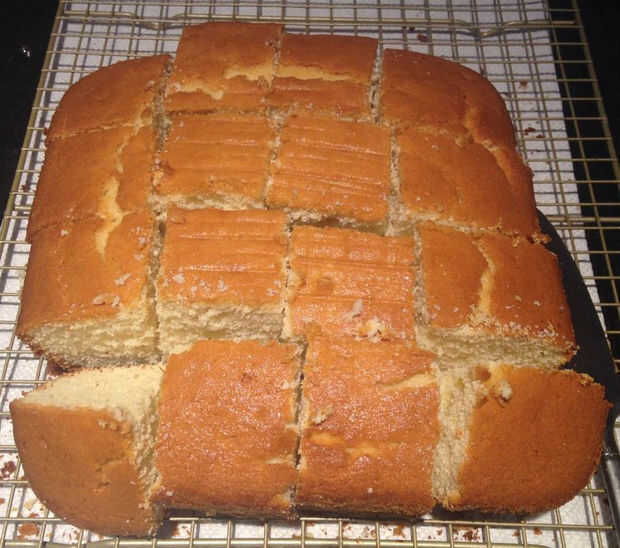 Después de que el pastel se enfría totalmente y a fondo, usted puede cortar en cuadrados. Generalmente, un pastel de 8 x 8 hace 16 plazas de buen tamaños.
