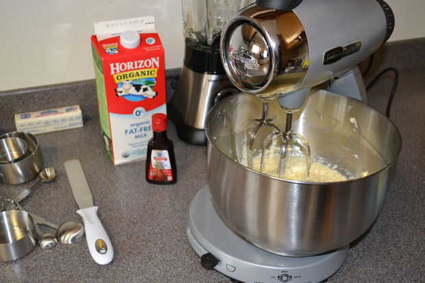 Agregue la leche y la vainilla.