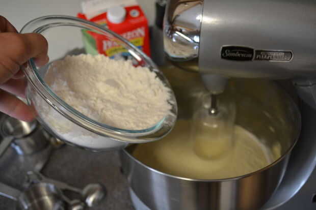 Añadir gradualmente la mezcla de harina a la mezcla de mantequilla.