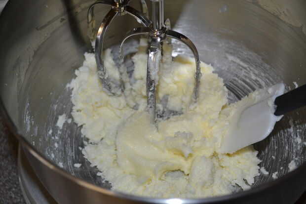 Creme la mantequilla y el azúcar con una batidora hasta ligero y mullido.