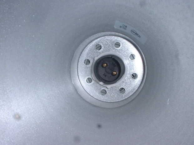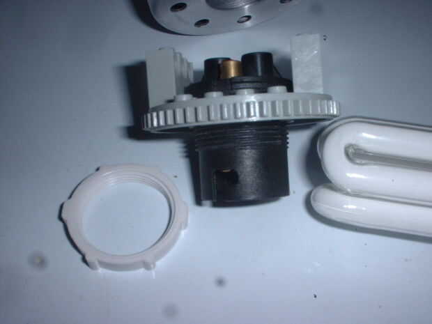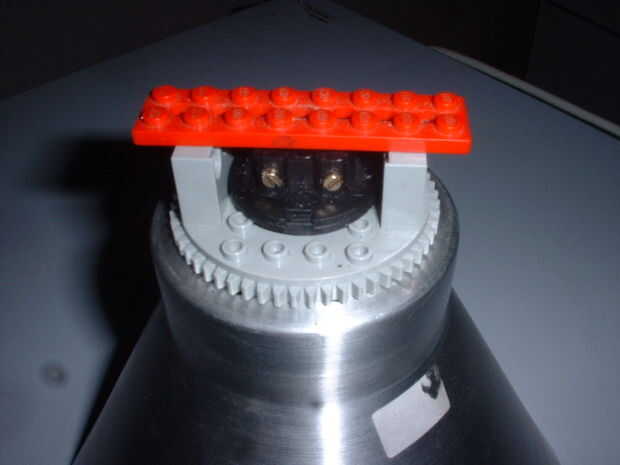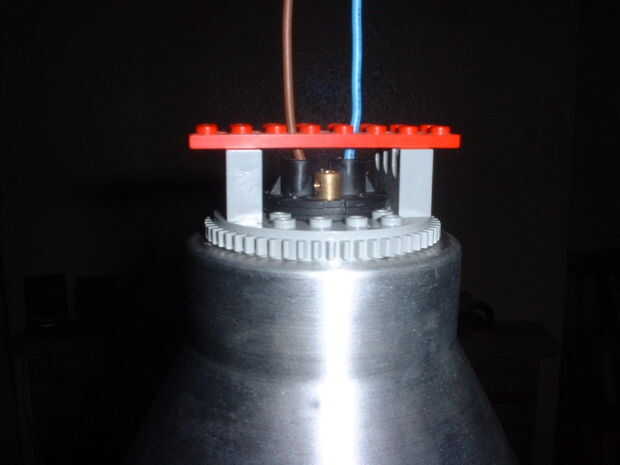 La bayoneta empuja a través de la mitad de un gran eje vertical gris y la sombra, se asegura con un anillo roscado. Una pieza de Lego fue agregada a la parte superior para reducir el riesgo de tocar los terminales con los dedos.