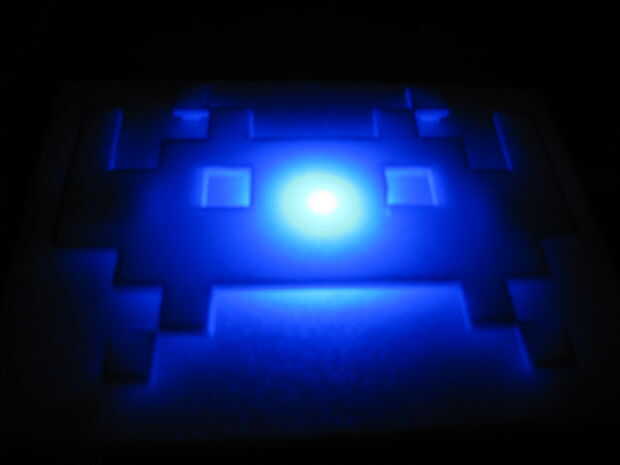 pegue a sus espaciadores sobre una base y corte un orificio para el led en la base. Luego pegue el formulario en los espaciadores.
