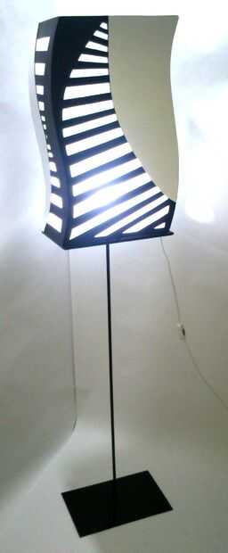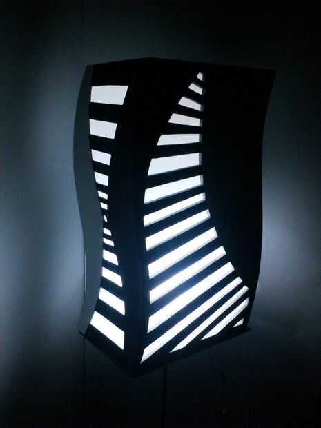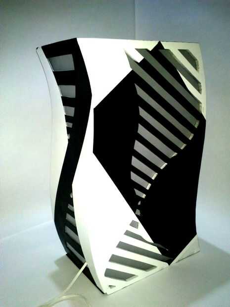 Cortamos las 6 caras de la lámpara, que depende del tamaño que quieras, (el tamaño de la imagen es 55 x 34 x 21 cm), las dos caras grandes se cortan en material de 5mm, se cortan las caras laterales en material 3 m m; también, tienes que cortar los agujeros en las formas que quieras con la plantilla; las caras laterales se pegan a las caras frente a través de clavos y pegamento de madera así que, las caras laterales tendrá la forma ondulada. Entonces tienes que pintar las caras también con las formas que desee utilizar la pintura blanco y negro. En el interior de la caja, tienes que pegar el papel de pergamino que cubre los orificios, y finalmente tienes que poner la conexión interior. Puede usar esto con una base o poco más de una tabla.