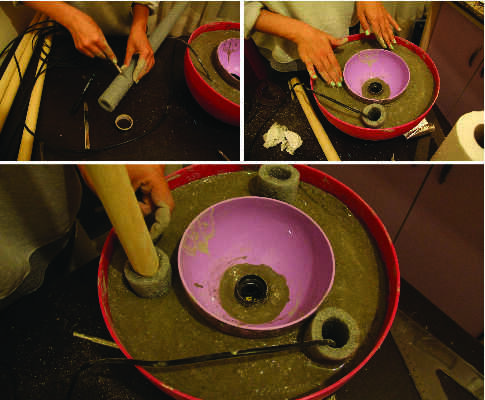 Luego, utilicé material aislante para construir las lagunas donde se colocaría en las zapatas de madera. He sellado un extremo del material con la ayuda de una cinta y algún material de aislamiento y colocan el material en el hormigón para que su extremo sellado permanecería dentro del concreto. Soltó el cable pasando a través de uno de los huecos preparados para las zapatas de madera para que el cable, que se salga el concreto, podría pasar a través del canal de madera.