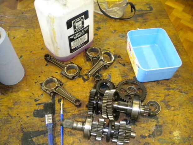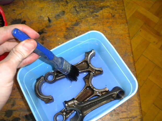 Desengrasar los componentes del motor utilizando un producto desengrasante en base solvente, una brocha es buena para entrar en las áreas difíciles.